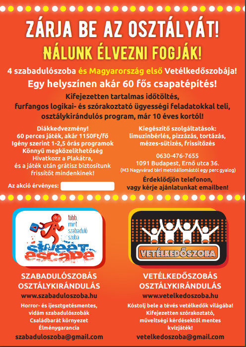 Történelmi körutazás a Felvidéken (4 nap, 3 éjszaka) Szállás: 3 éj (Dunaszerdahely) Finanszírozás: a pályázat az utazást, szállást, étkezést, belépődíjakat és 3 fő kísérőtanár munkadíját támogatja. Nem támogatja az idegenvezető díját és költségeit (általában 18.000 Ft/nap + szállás, étkezés). Ezt a költséget – ha igénylik – a csoportnak kell állnia. Önrész: 0 Ft, minimum 36 [...]bővebbenPost of Történelmi körutazás a Felvidéken on 2017 Nov 10th at 11:14:59