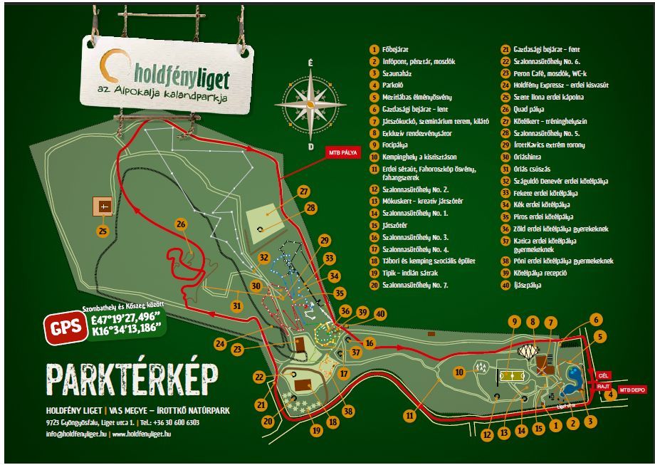 A kalandpark pályái:Erdei drótkötélpálya, Száguldó Denevér pálya, Kenuzás a Gyöngyös patakon, Jégcsákányos mászás, Íjászat, Csúszókorong pálya, Focipálya, Modellvasút terepasztal, Erdei quad akadálypálya, Óriáshinta, Ládatorony építése, Winnetou vadászösvény, MTB kerékpáros pálya, Kosárpalánk, Manósétány, Gokart, Vízi buborék, Bátorságugrás, Aranymosás, Kreatív játszótér, Ping-pong asztal, Erdei szűknyomtávú kisvasút, Drótkötélpálya, Lógatott gerenda mászás, Indián 7 próba, Trambulin, Lengőteke.