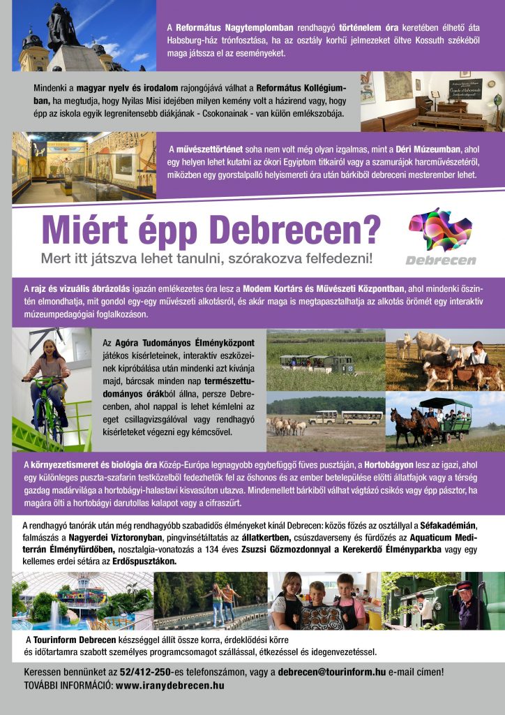 A rendhagyó tanórák után még rendhagyóbb szabadidős élményeket kínál Debrecen: közös főzés az osztállyal a Séfakadémián, falmászás a Nagyerdei Víztoronyban, pingvinsétáltatás az állatkertben, csúszdaverseny és fürdőzés az Aquaticum Mediterrán Élményfürdőben, nosztalgia-vonatozás a 134 éves Zsuzsi Gőzmozdonnyal a Kerekerdő Élményparkba vagy egy kellemes erdei sétára az Erdőspusztákon.
